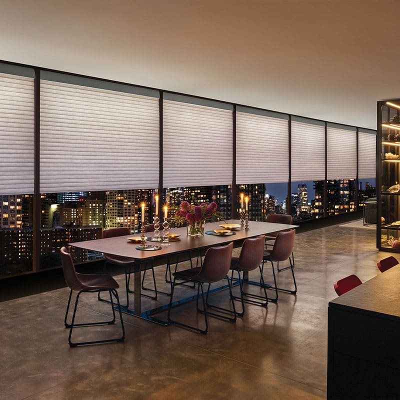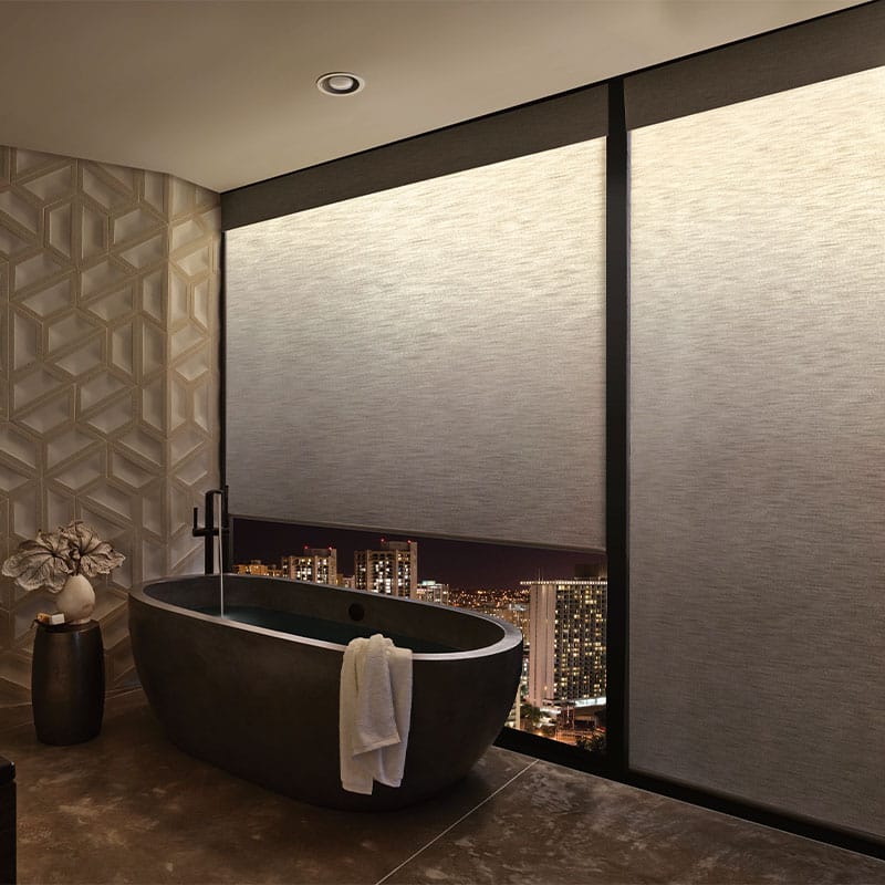 Aura® Illuminated Shades combine premium fabrics with sleek architectural design to bring light and style into your home. Integrated accent lighting softly illuminates the shade from behind, creating a warm, ambient glow even when the shade is fully closed. This unique feature enhances depth and atmosphere, making your window coverings a striking focal point that elevates the mood of any space.